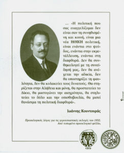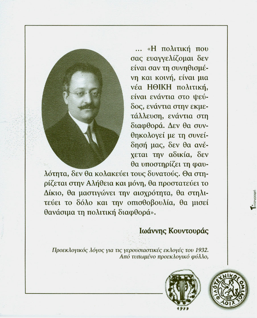 Απόψε έχομε την ξεχωριστή ευχαρίστηση να έχομε ανάμεσά μας τον κ. Λίνο Κουντουρά, γυιο του Μίλτου Κουντουρά, και τον Ιωάννη Βουλιουρή, εγγονό τού Ιωάννου Κουντουρά. Μάλιστα, η Ρένα Κουντουρά – Βουλιουρή, η μητέρα του κ.Βουλιουρή, ήταν η νονά του Ανδρέα Παπανδρέου, κατά την τετραετή περίπου παραμονή στη Χίο του ζεύγους Γεωργίου Παπανδρέου και Σοφίας Μινέϊκο. Φροντίσαμε και στείλαμε για την αποψινή βραδιά πρόσκληση και στον Γεώργιο Ανδρέα Παπανδρέου. Προχθές, σε τηλεφώνημα από την Ιπποκράτους, από την Γραμματέα του Πρωθυπουργού, είχαμε την πληροφορία ότι ο Πρωθυπουργός έλαβε γνώση της πρόσκλησης και όπως είναι φυσικόν, λόγω υποχρεώσεων δεν ήταν δυνατόν να βρίσκεται απόψε κοντά μας. Όμως, παρεκάλεσε να διαβιβάσω προς όλους τους χαιρετισμούς του.