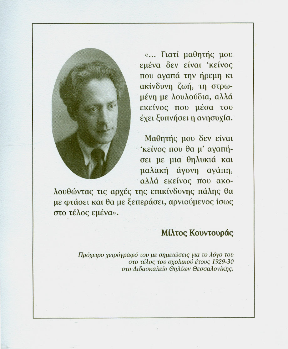 Στη συνέχεια ο Πρόεδρος του Φιλοτεχνικού Ομίλου Μυτιλήνης κ. Περικλής Μαυρογιάννης θα μας μιλήσει για τον Μίλτο Κουντουρά με θέμα: «Μίλτος Κουντουράς, ο Εικονοκλάστης Παιδαγωγός. 70 χρόνια μετά την αποδημία του (1940 – 2010)».